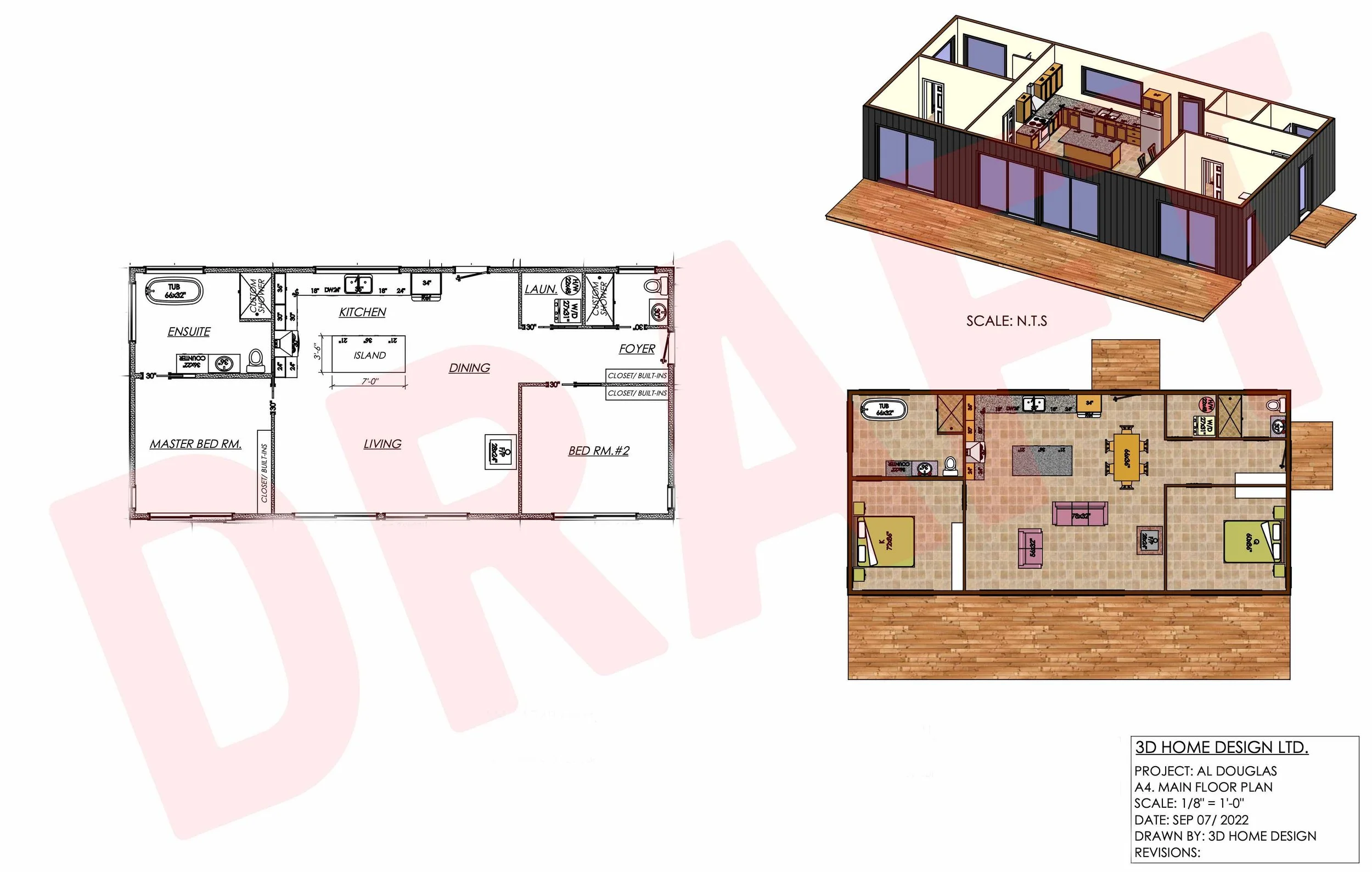 The simple stuff - the design above, as you can see, is a 2 bedroom, 2 bathroom space with an open concept kitchen/living area. Nothing groundbreaking but very functional with some nice touches. We wanted to keep it as small as we thought we could get it - the build is 24x52 so we’re clocking in at just under 1200sq/ft of actual living space.